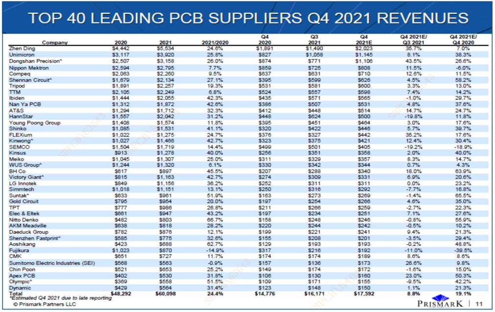 近期,国际知名电子行业咨询集团Prismark Partners发布2021年第四季度全球40强PCB企业排行榜与数据分析报告,共有七家内资企业上榜。其中,3044永利科技在2021年第四季度全球PCB企业四十强排行榜中位列第22名,在内资PCB企业中位列第4名。